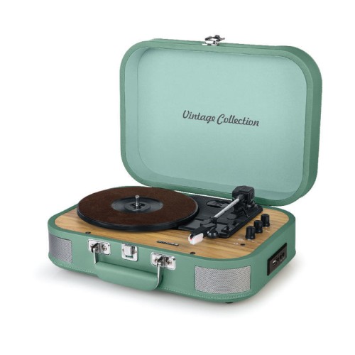 Πικάπ «βαλίτσα» με ξύλινα πόδια με Bluetooth® (in/out), δυνατότητα εγγραφής και αναπαραγωγής από USB..