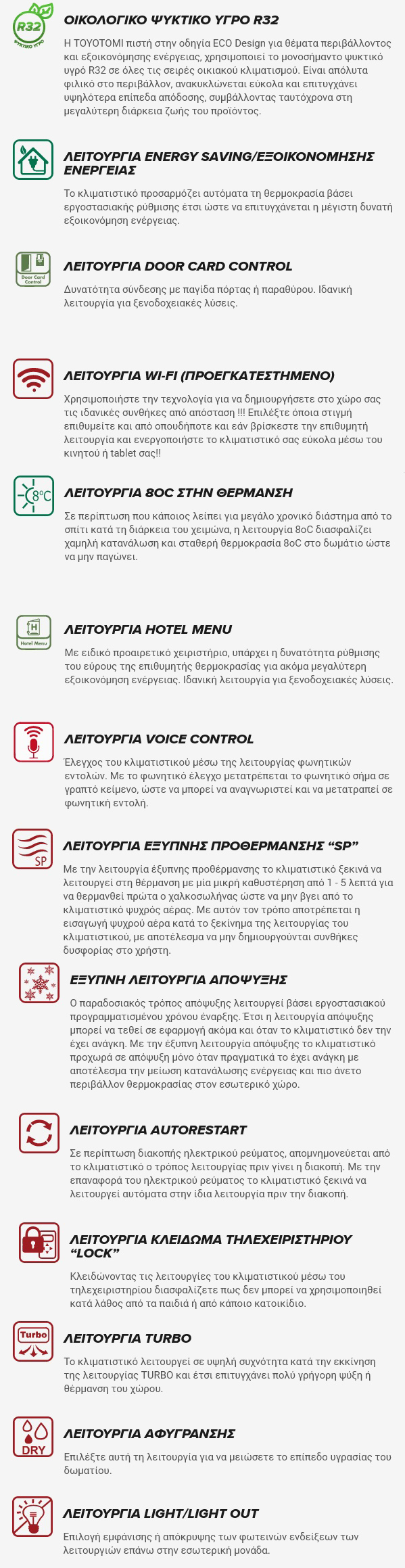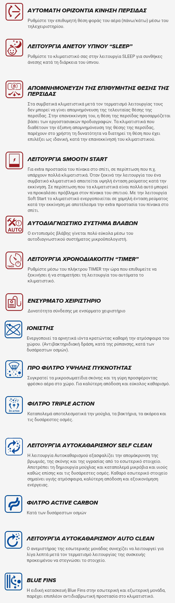 Έξυπνη προθέρμανση SP, Turbo, Timer, Απόψυξης, Αυτοδιαγνωστικός σύστημα βλαβών, Αφύγρανση, AutoRestart, AutoClean, SelfClean, Smooth Start, Light Mode, Sleep Mode, Lock, 8°C Heating |