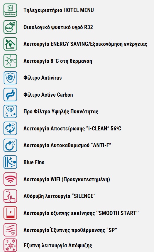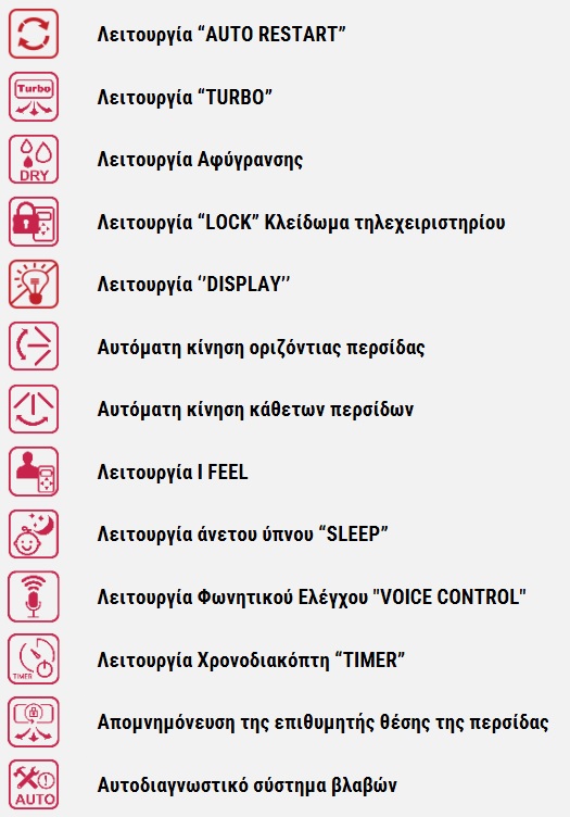 ΕΞΥΠΝΗΣ ΠΡΟΘΕΡΜΑΝΣΗΣ SP, TURBO, TIMER, ΑΠΟΨΥΞΗΣ, ΑΥΤΟΔΙΑΓΝΩΣΤΙΚΟ ΣΥΣΤΗΜΑ ΒΛΑΒΩΝ, ΑΦΥΓΡΑΝΣΗΣ, AUTORESTART, ΑΥΤΟΚΑΘΑΡΙΣΜΟΥ ANTI-F, ΑΠΟΣΤΕΙΡΩΣΗΣ ''i-CLEAN'' 56°C, SMOOTH START, ENERGY SAVING, ΟΡΙΖΟΝΤΙΑ ΚΙΝΗΣΗ ΠΕΡΣΙΔΩΝ ΜΕΣΩ ΤΗΛΕΧΕΙΡΙΣΤΗΡΙΟΥ (Πάνω/Κάτω), ΚΑΘΕΤΗ ΚΙΝΗΣΗ ΠΕΡΣΙΔΩΝ ΜΕΣΩ ΤΗΛΕΧΕΙΡΙΣΤΗΡΙΟΥ (Δεξιά/Αριστερά), DISPLAY, SLEEP, ΑΝΤΙΔΙΑΒΡΩΤΙΚΗ ΠΡΟΣΤΑΣΙΑ "BLUE FINS", ΑΠΟΜΝΗΜΟΝΕΥΣΗ ΤΗΣ ΘΕΣΗΣ ΤΗΣ ΠΕΡΣΙΔΑΣ, ΛΕΙΤΟΥΡΓΙΑ LOCK, ΛΕΙΤΟΥΡΓΙΑ SILENCE, ΛΕΙΤΟΥΡΓΙΑ I-FEEL, "VOICE CONTROL", "8oC HEATING, ΔΥΝΑΤΟΤΗΤΑ ΤΗΛΕΧΕΙΡΙΣΤΗΡΙΟΥ HOTEL MENU |