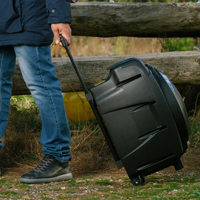 Χάρη στα ροδάκια μπορείς να το μεταφέρεις παντού σαν βαλίτσα και μπορεί να δουλεύει με ρεύμα ή με την μπαταρία.