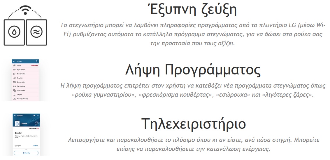 Από τη ρύθμιση του κατάλληλου προγράμματος στεγνώματος, μέχρι τη λήψη νέων προγραμμάτων, το στεγνωτήριό σας μόλις έγινε πιο έξυπνο. Η σύνδεση Wi-Fi επιτρέπει την εύκολη αλληλεπίδραση και την πρόσβαση στις τελευταίες καινοτομίες.