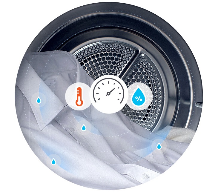 Οι αισθητήρες υγρασίας και θερμοκρασίας της μονάδας ανιχνεύουν αυτόματα το επίπεδο και ρυθμίζουν τον βέλτιστο χρόνο στεγνώματος. Προστατεύουν τα ρούχα σας από τη ζημιά που προκαλεί η υπερβολική θερμότητα.