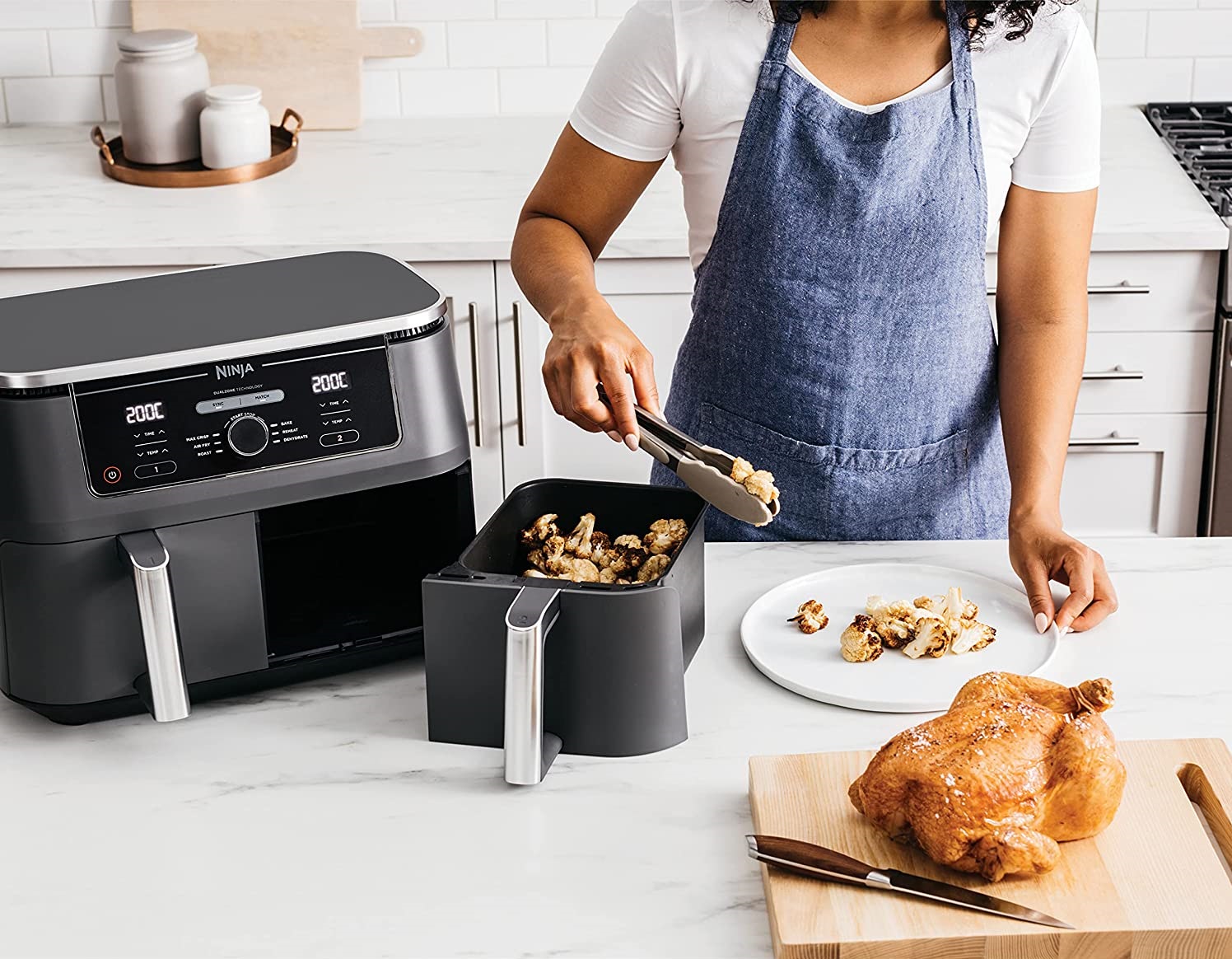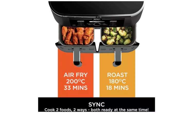 Με την τεχνολογία DualZone μπορείς ανά πάσα στιγμή να έχεις τον έλεγχο του φαγητού σου! Με την τεχνολογία SYNC μπορείς να μαγειρέψεις δύο διαφορετικά φαγητά χρησιμοποιώντας διαφορετικούς χρόνους, θερμοκρασίες και προγράμματα και να έχεις και τα δυο έτοιμα για σερβίρισμα ταυτόχρονα! Θέλεις να ψήσεις στο ένα συρτάρι και να τηγανίσεις στο άλλο; Κανένα πρόβλημα! Διαφορετικοί χρόνοι μαγειρέματος για ψητό κοτόπουλο και τραγανές πατάτες; Και οι δύο ζώνες ολοκληρώνουν το μαγείρεμα ταυτόχρονα, ώστε να μπορείς να απολαύσεις φρεσκομαγειρεμένα κυρίως γεύματα και συνοδευτικά μαζί χωρίς να χρειάζεται να χρησιμοποιείς διαφορετικές συσκευές! Είτε πρόκειται για ολόκληρο κοτόπουλο 2 κιλών και αφράτες ψητές πατάτες, ψημένο σολομό και μεσογειακά λαχανικά είτε ζουμερά μοσχαρίσια κεφτεδάκια και χρυσαφένιες τηγανιτές πατάτες, ο τέλειος συνδυασμός απέχει μόλις λίγα λεπτά.