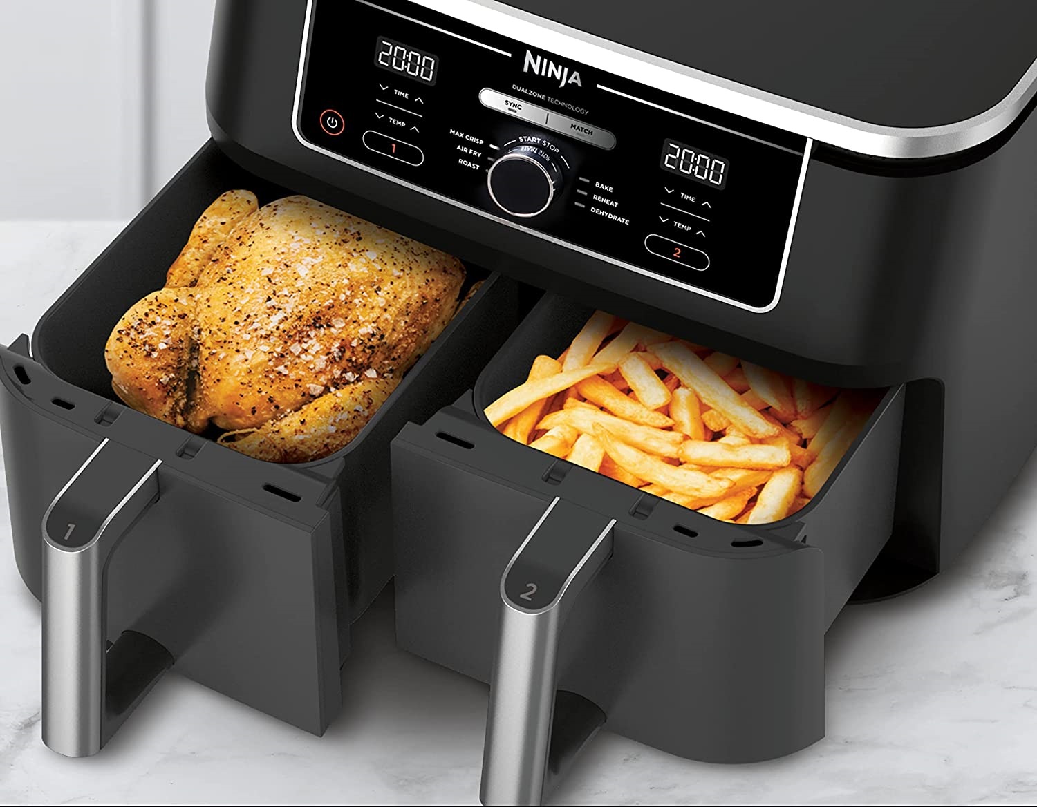 Όσο αφορά το μαγείρεμα, ο συγχρονισμός είναι το παν! Ιδανική για οικογένειες και μεγάλα νοικοκυριά, η φριτέζα αέρα Ninja Foodi MAX Dual Zone 9.5L κάνει όλη τη δουλειά για σένα. Μαγείρεψε 2 διαφορετικά φαγητά με διαφορετικές θερμοκρασίες, χρόνους και ρυθμίσεις σε 2 ξεχωριστές ζώνες μαγειρέματος για να έχεις και τα δύο έτοιμα για σερβίρισμα ακριβώς την ίδια στιγμή χρησιμοποιώντας τη λειτουργία SYNC! Μαγείρεμα για περισσότερα άτομα; Ταίριαξε τις ρυθμίσεις και στις δύο ζώνες με τη λειτουργία MATCH για να διπλασιάσεις την ποσότητα φαγητού στον ίδιο χρόνο μαγειρέματος!