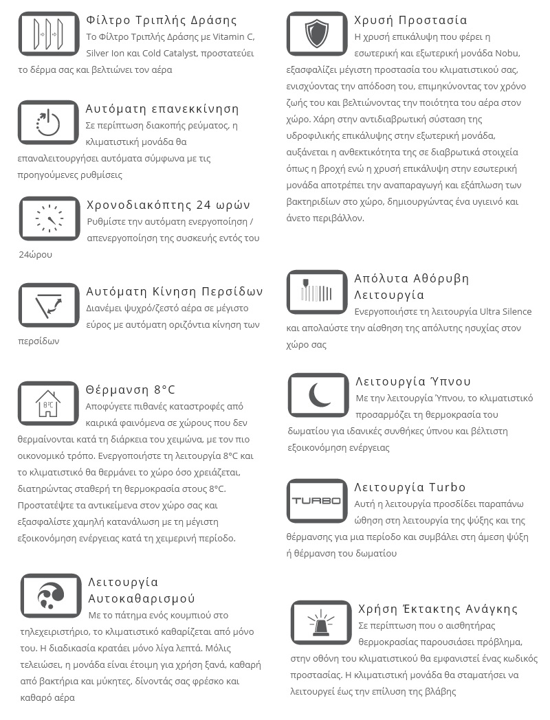 Όλα τα προϊόντα κλιματισμού Nobu, συνοδεύονται από 5ετή εγγύηση. Η υψηλή ποιότητα παραγωγής, αλλά και οι ποιοτικές πρώτες ύλες, εγγυώνται την άψογη λειτουργία των κλιματιστικών Nobu για πολλά χρόνια, ακόμα και σε απαιτητικές συνθήκες λειτουργίας. Το ανταγωνιστικό αυτό πλεονέκτημα των προϊόντων κλιματισμού Nobu είναι η δέσμευση μας, προς τους καταναλωτές, για την ποιότητα και την πιστότητα των προϊόντων μας.