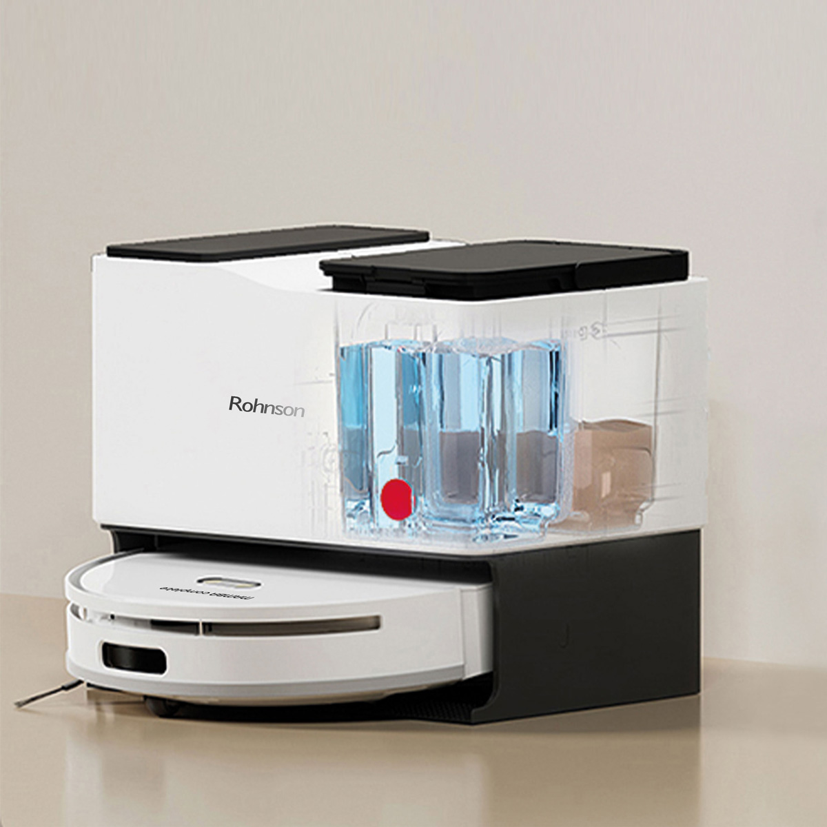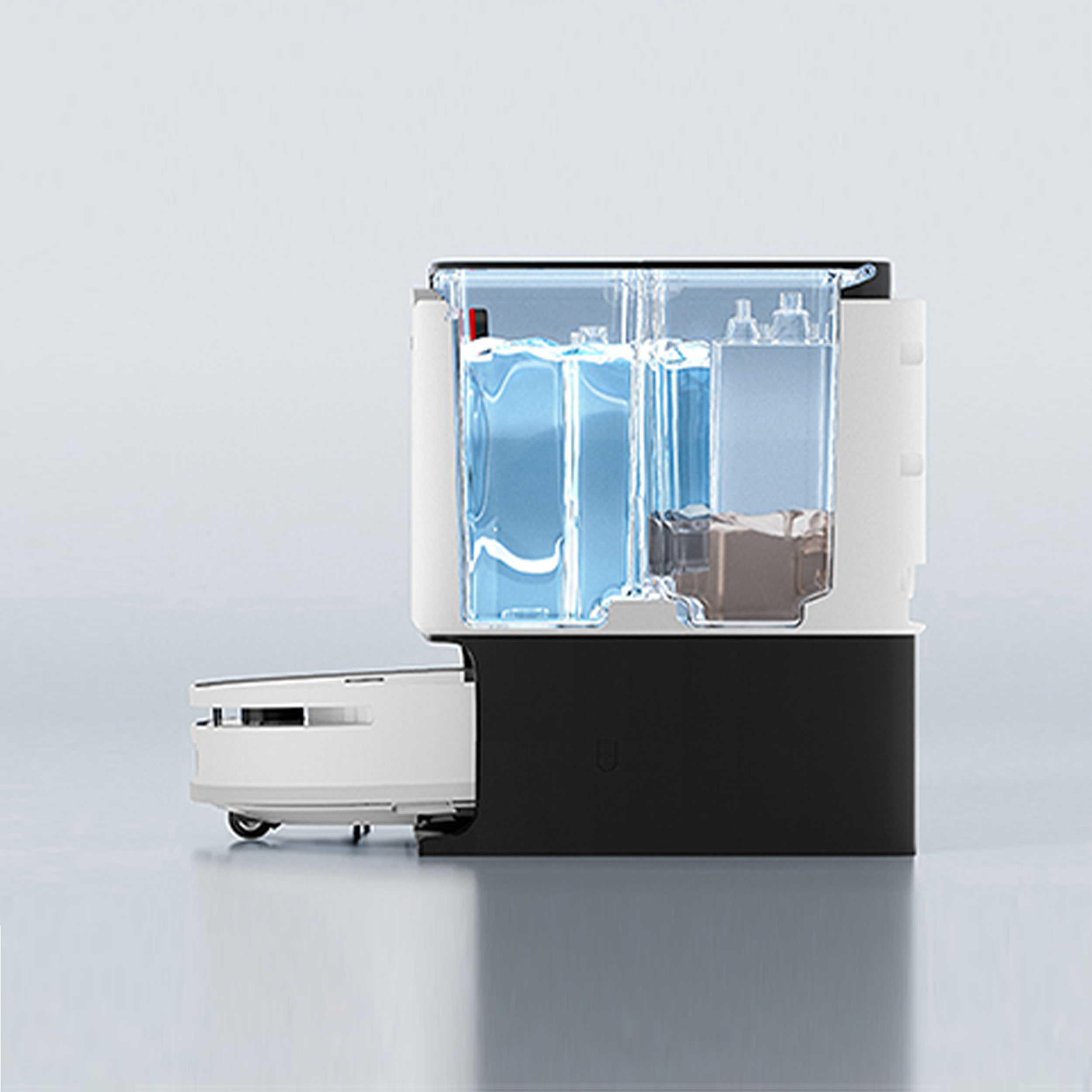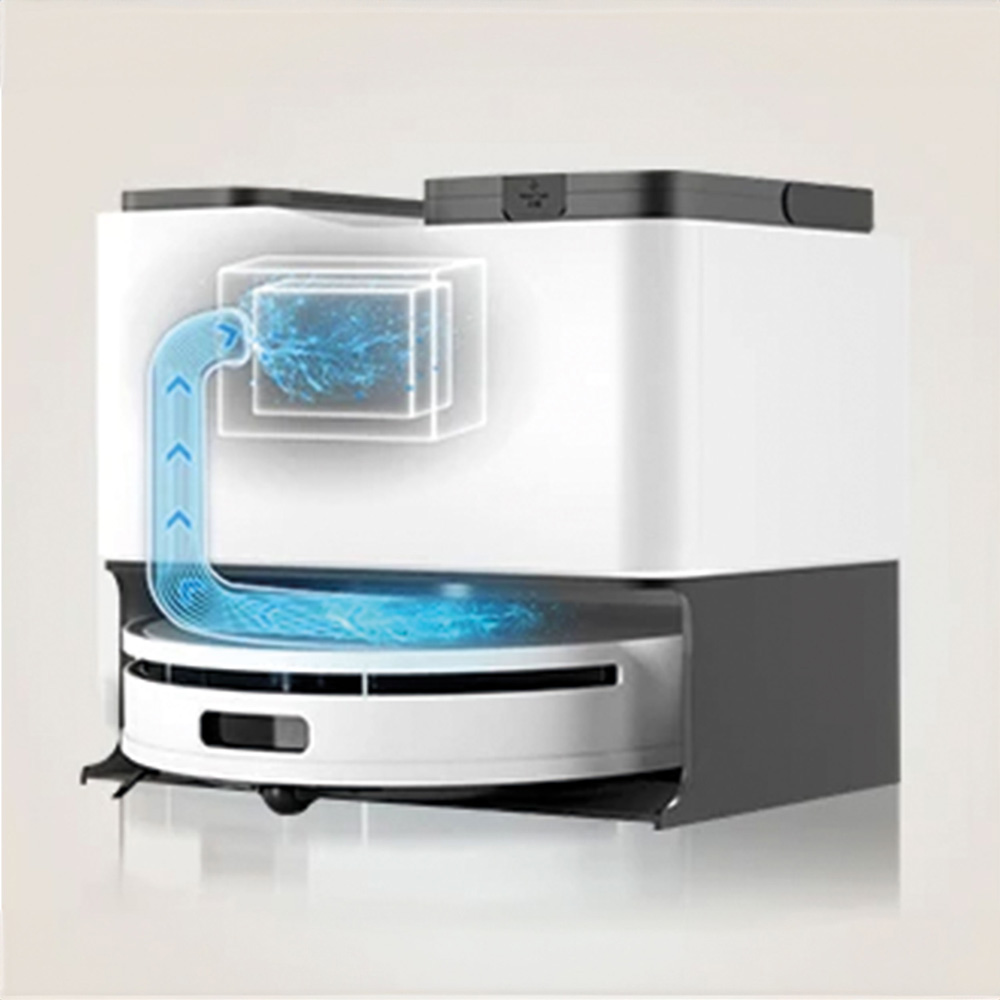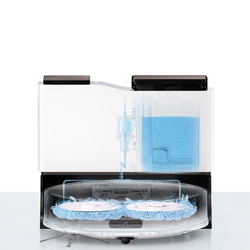 Ο κάδος 4lt της ρομποτικής σκούπας διαθέτει δύο διαφορετικά δοχεία νερού. Η σκούπα εφοδιάζεται με καθαρό νερό από την δεξαμενή. Όταν ολοκληρώσει το σφουγγάρισμα επιστρέφει στην βάση, αδειάζει το βρόμικο νερό και εφοδιάζεται ξανά με καθαρό νερό. Αυτό έχει ως αποτέλεσμα να σφουγγαρίζετε πάντα με καθαρό νερό.
