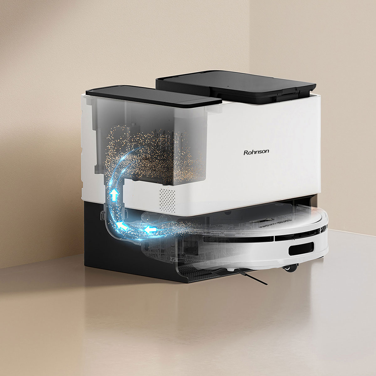 Η έξυπνη σκούπα ρομπότ, πηγαίνει αυτόματα να αδειάσει στον κάδο απορριμμάτων που αποτελεί παράλληλα και βάση φόρτισης. Έτσι, δίνει τη δυνατότητα στο χρήστη να μην καθαρίζει τη σκούπα μόνος του και να μην έρχεται σε επαφή με τη σκόνη.
