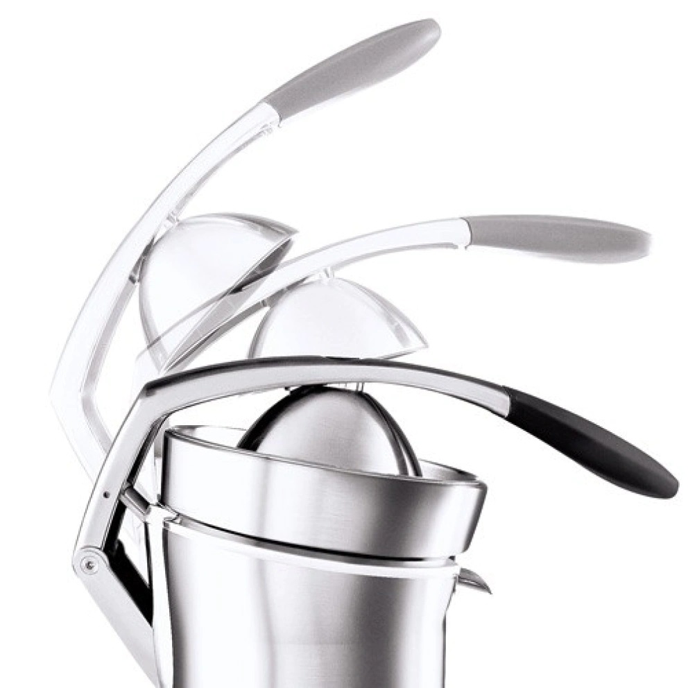 Ο μοναδικός εργονομικά σχεδιασμένος τριπλός βραχίονας με μεντεσέ εξασφαλίζει πίεση προς τα κάτω καθ’όλη της διαδικασία εξαγωγής του χυμού. Ο διακόπτης ασφαλείας δεν θα επιτρέψει στον κώνο να περιστρέφεται μέχρι να χαμηλώσει τόσο ο βραχίονας όσο και να τοποθετηθεί επαρκής πίεση στο πάνω μέρος του κώνου.