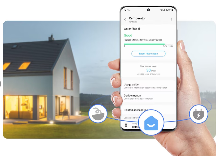 Φροντίστε εύκολα το ψυγείο σας. Το SmartThings Home Care* παρέχει παρακολούθηση και ειδοποιήσεις ώστε να μπορείτε να ελέγξετε την κατάστασή του. Επίσης, σας ειδοποιεί αυτόματα εάν τα εξαρτήματα χρειάζονται αντικατάσταση ή αν ανιχνεύονται προβλήματα και προτείνει μια λύση.